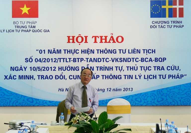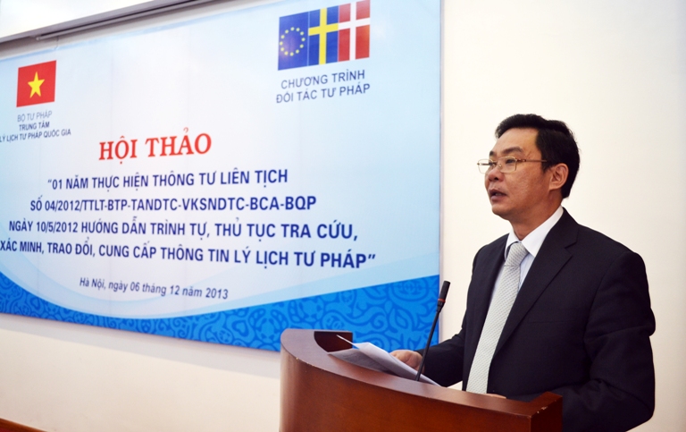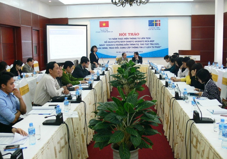 Sau Báo cáo dẫn đề Hội thảo do ông Đặng Thanh Sơn, Giám đốc Trung tâm Lý lịch tư pháp quốc gia thuyết trình tại Hội thảo, các đại biểu đã nghe bà Đỗ Thị Thúy Lan, Phó Giám đốc Trung tâm Lý lịch tư pháp quốc gia trình bày báo cáo tham luận “ Nhìn lại 01 năm thực hiện Thông tư liên tịch số 04/2012/TTLT-BTP-TANDTC-VKSNDTC-BCA-BQP ngày 10/5/2012 hướng dẫn trình tự, thủ tục tra cứu, xác minh, trao đổi, cung cấp thông tin lý lịch tư pháp” và 13 bài tham luận, ý kiến phát biểu của các đại biểu là đại diện cho Tòa án nhân dân tối cao; Cục Hồ sơ nghiệp vụ cảnh sát, Bộ Công an; Cục theo dõi thi hành án hình sự và hỗ tư pháp, Bộ Công an; Tòa án quân sự Trung ương; Trại tạm giam số 1, Công an Hà Nội; đại diện của Sở Tư pháp thành phố Hồ Chí Minh, Hà Tĩnh, Hải Dương, Bắc Ninh… Các đại biểu đã trao đổi và thảo luận sôi nổi trên tinh thần thẳng thắn và dân chủ, tập trung vào những kết quả đạt được, những hạn chế, bất cập, và đề xuất các giải pháp nhằm nâng cao hiệu quả thi hành Thông tư liên tịch số 04/2012/TTLT- BTP-TANDTC-VKSNDTC-BCA-BQP.