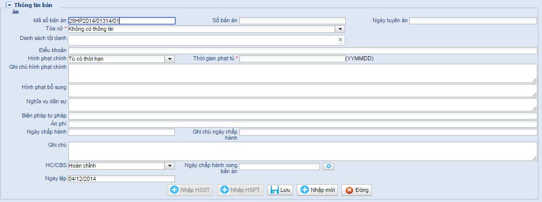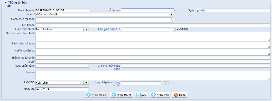 Bước 2: Bấm nút nhập HSST, nhập theo màn hình dưới đây, mã số bản sơ thẩm là 01ST: